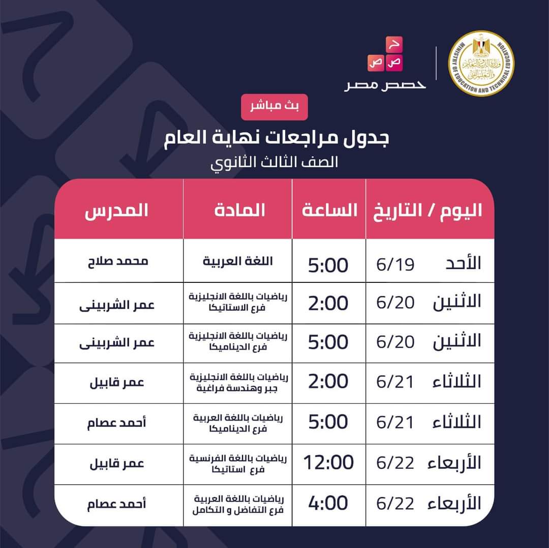 وأعلنت الوزارة عبر صفحتها الرسمية على موقع التواصل الاجتماعي فيسبوك، مواعيد البث المباشر بدءًا من يوم الأحد 19 يونيو حتى الأربعاء 22 يونيو، لافتة المراجعة تبدأ بمادة اللغة العربية.
