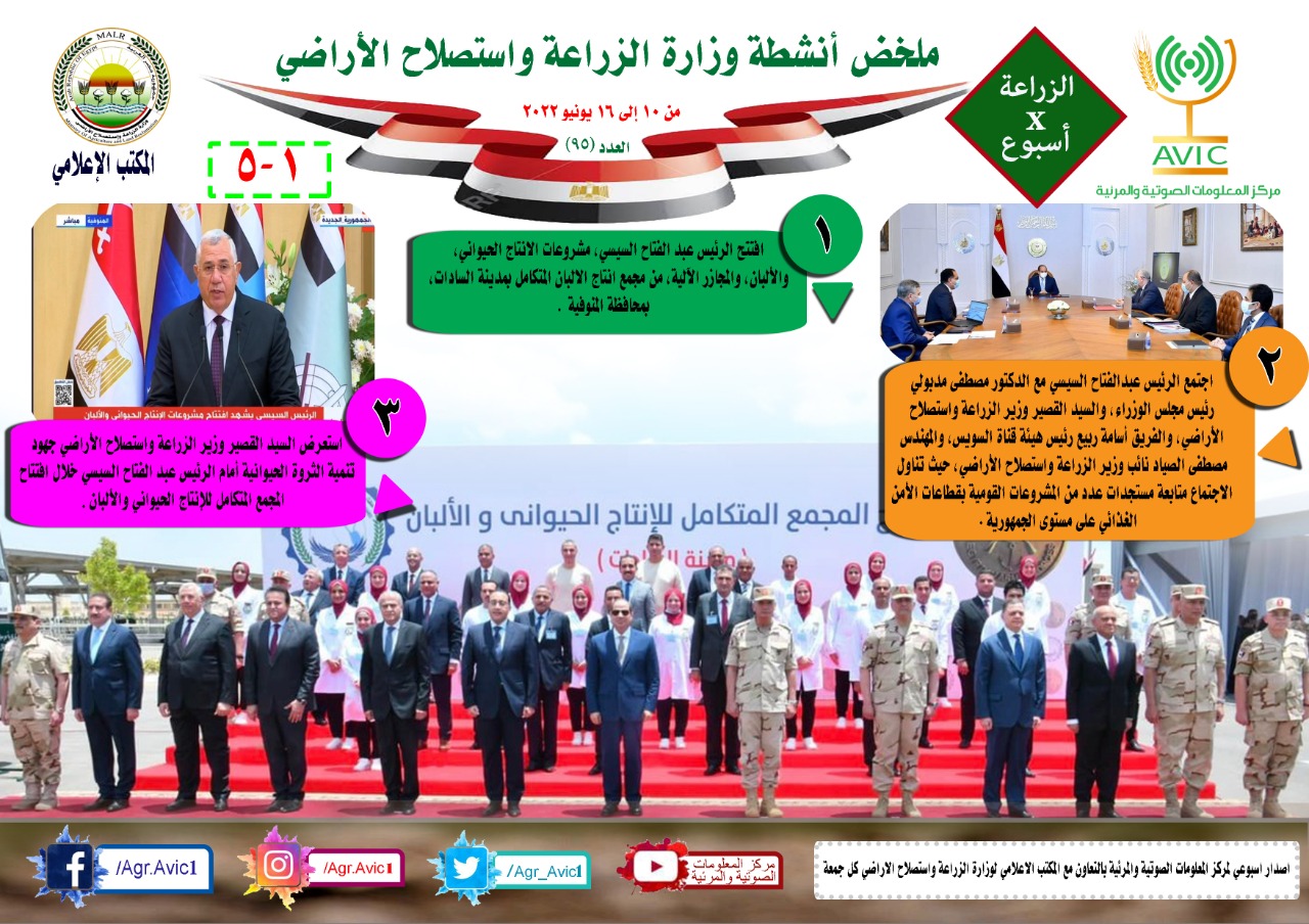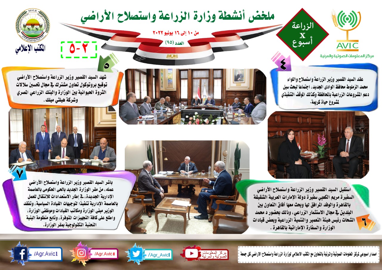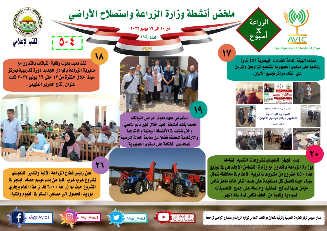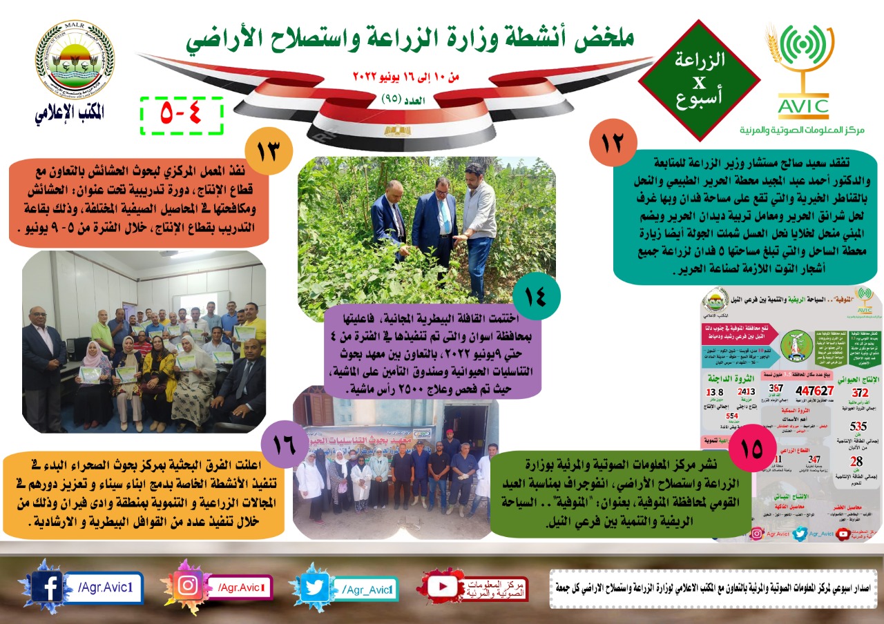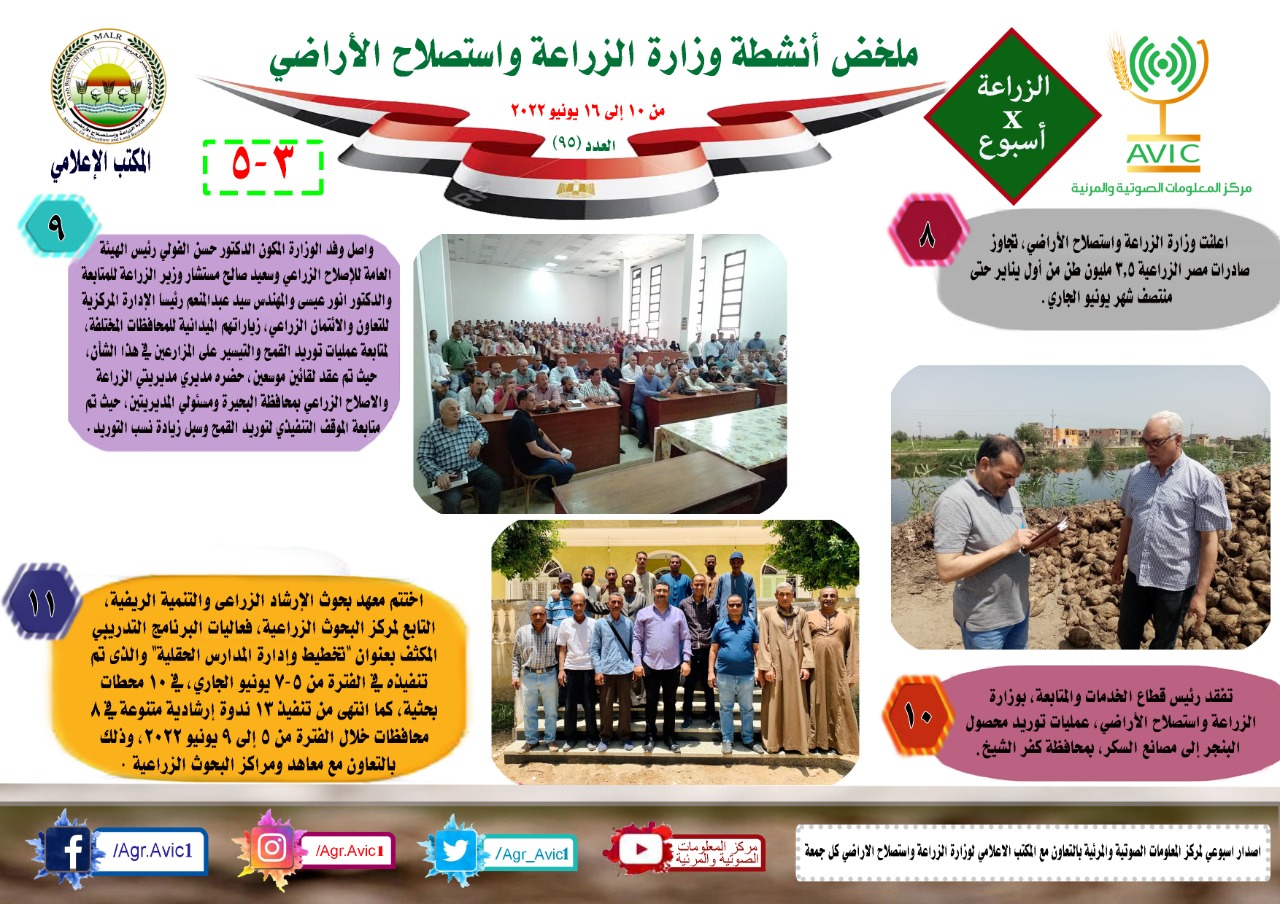أصدر مركز المعلومات الصوتية والمرئية، التابع لوزارة الزراعة واستصلاح الأراضي، الانفوجراف الأسبوعي، في نسخته رقم 95، حول الحصاد الأسبوعي لأهم أنشطة الوزارة، خلال الأسبوع الماضي في الفترة من 10 حتى 16 يونيو الجاري، وذلك بالتعاون مع المكتب الإعلامي للوزارة.