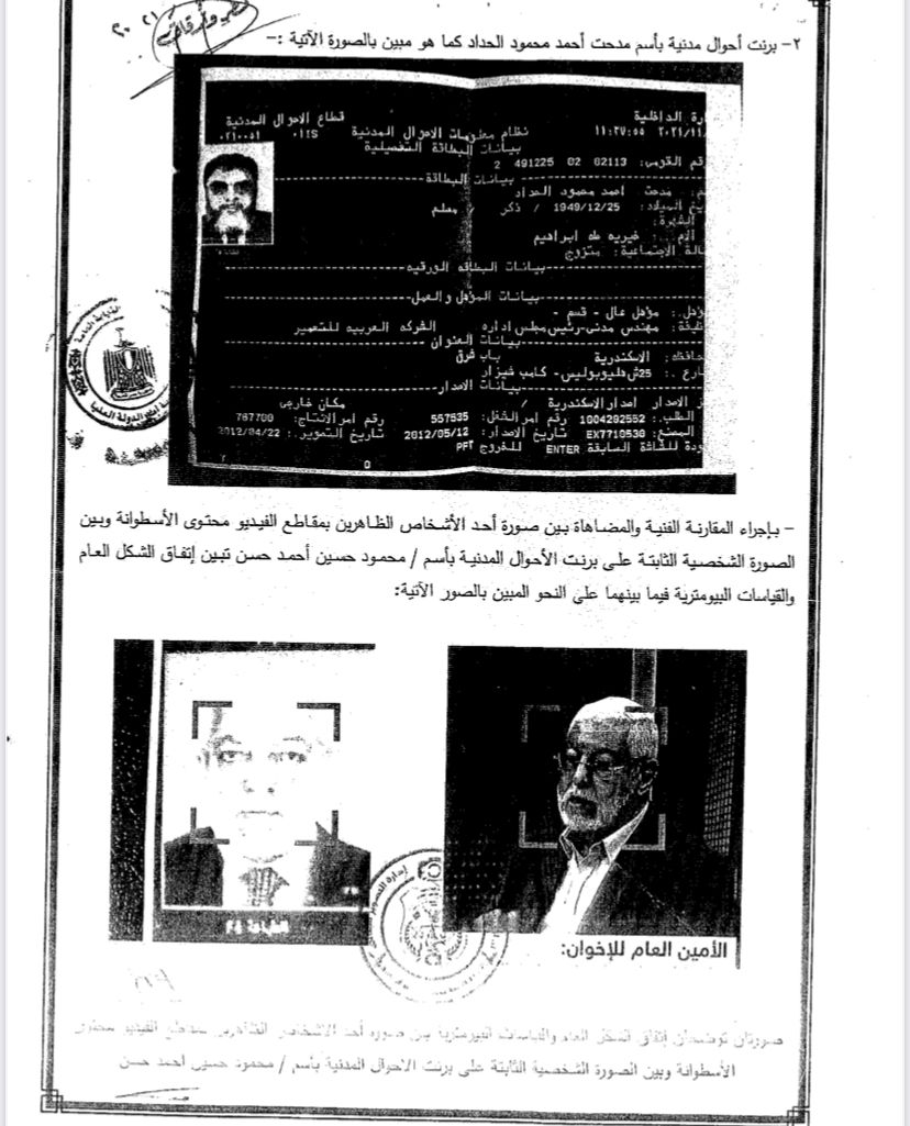 وحصل القاهرة 24، على تقرير الإدارة العامة لتحقيق الأدلة الجنائية، بوزارة الداخلية، في القضية التي حملت رقم 7449 لسنة 2022 جنايات النزهة، والمقيدة برقم 806 لسنة 2022 كلي شرق القاهرة، ورقم 1269 لسنة 2019 حصر أمن الدولة العليا، حيث إنه ايماء للكتاب الوارد من جهات التحقيق بخصوص فحص الأحراز عبارة عن أسطوانة Cd، وعدد 2 برنت أحوال مدنية في القضية رقم 1269 حصر أمن دولة العليا، ومـقـاطع مرئيــة تخـص المتهمـين محمـود حسين أحمـد حسـين، مـدحت أحمـد محمـود الحـداد، ومـدى صـلتهم التنظيمية بجماعـة الإخـوان، ومشـاهدة محتواهـا، تبين وجود المقاطع الآتية: المقطـع المرئـي الأول: مدتــه ســبع دقــــائق و23 ثانية، بعنـوان: بعـد 90 عامـا مـن تأسيس جماعة الإخـوان المســلمين مــــــاذا قـدمت الجماعـة للشعوب الإسلامية؛ تحـدث فيـه المـتـهم مـدحت أحمـد محمـود الحـداد بصفته عضو مكتـب الشـورى العـام لجماعـة الإخـوان، عبر أحد البــرامج التليفزيونية المذاعة بقناة مكملين الفضائية.