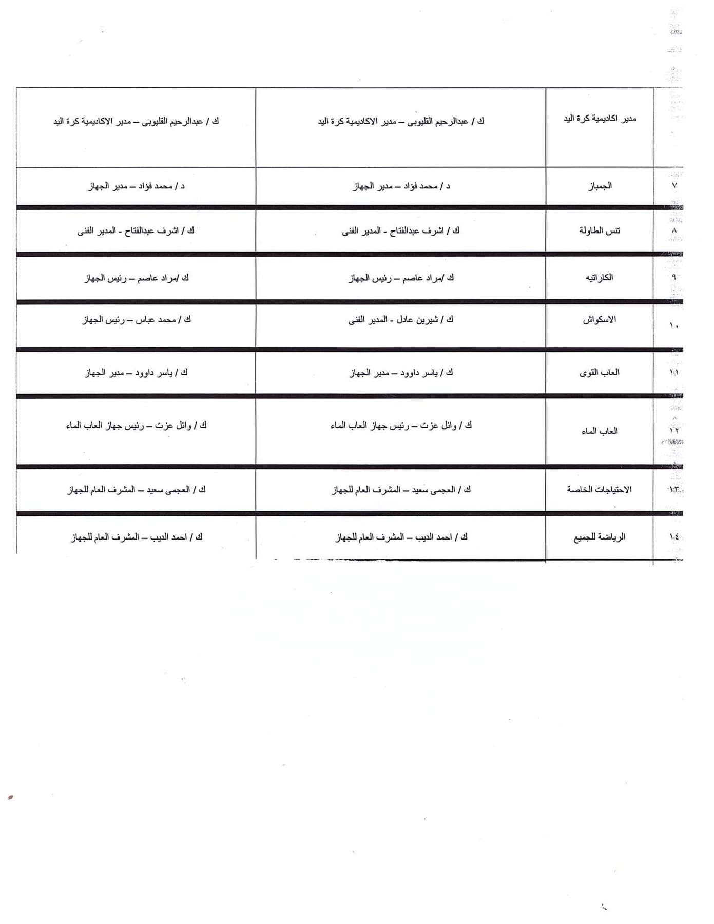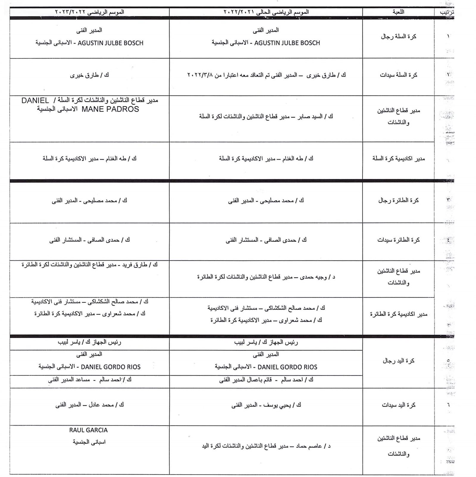 وجاءت الأجهزة الفنية للألعاب الرياضية بالنادي بتشكيلها الجديد على النحو التالي:-