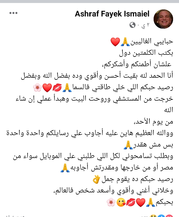 وكتب أشرف فايق، منشورًا عبر حسابه الشخصي بموقع، فيس بوك، جاء فيه: خرجت من المستشفى، وهبدأ عملي إن شاء الله من يوم الأحد، والله العظيم هاين عليا أجاوب على رسايلكم واحدة واحدة، بس مش هقدر.