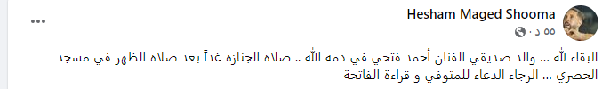 وكتب هشام ماجد عبر حسابه الشخصي على موقع التواصل الاجتماعي فيسبوك، الآتي: البقاء لله.. والد صديقي الفنان أحمد فتحي في ذمة الله.. صلاة الجنازة غدًا بعد صلاة الظهر في مسجد الحصري.. الرجاء الدعاء للمتوفي وقراءة الفاتحة.