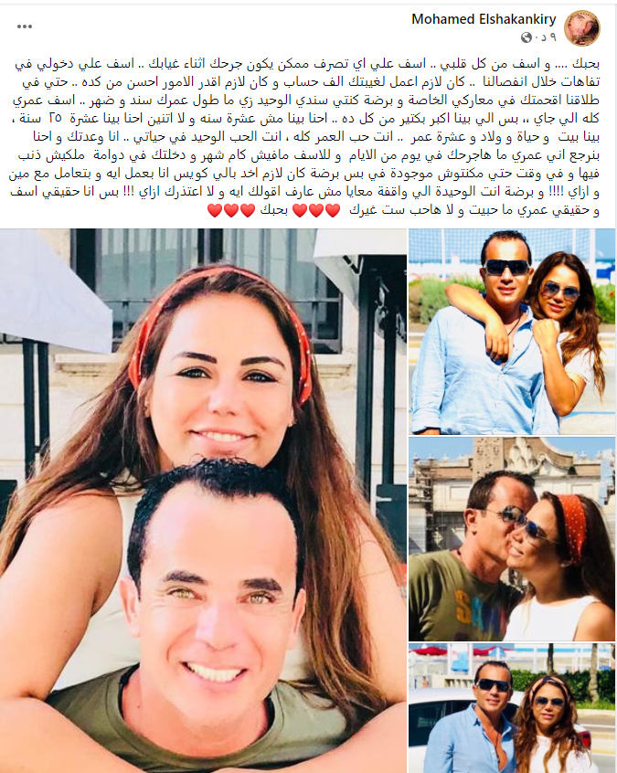 ونشر محمد الشقنقيري عدة صور جمعته بالفنانة مروة أمجد عبر حسابه الشخصي على موقع التواصل الاجتماعي فيسبوك، وعلق قائلًا: بحبك.. وآسف من كل قلبي.. آسف على أي تصرف ممكن يكون جرحك أثناء غيابك.. آسف على دخولي في تفاهات خلال انفصالنا.. كان لازم أعمل لغيبتك ألف حساب، وكان لازم أقدر الأمور أحسن من كدة.. حتى في طلاقنا أقحمتك في معاركي الخاصة، وبرضه كنتي سندي الوحيد زي ما طول عمرك سند وضهر.. آسف عمري كله اللي جاي.. بس اللي بينا أكبر بكتير من كل ده.. احنا بينا مش عشرة سنة ولا اتنين احنا بينا عشرة 25 سنة.. بينا بيت وحياة وولاد وعشرة عمر.. أنت حب العمر كله.. أنت الحب الوحيد في حياتي.. أنا وعدتك واحنا بنرجع إني عمري ما هاجرحك في يوم من الأيام، وللأسف مافيش كام شهر ودخلتك في دوامة ملكيش ذنب فيها، وفي وقت حتى مكنتوش موجودة في بس برضه كان لازم آخد بالي كويس.. أنا بعمل إيه وبتعامل مع مين وزاي! وبرضه أنت الوحيدة اللي واقفة معايا مش عارف أقولك إيه ولا اعتذرك إزاي !!! بس أنا حقيقي آسف وحقيقي عمري ما حبيت ولا هحب ست غيرك.. بحبك.