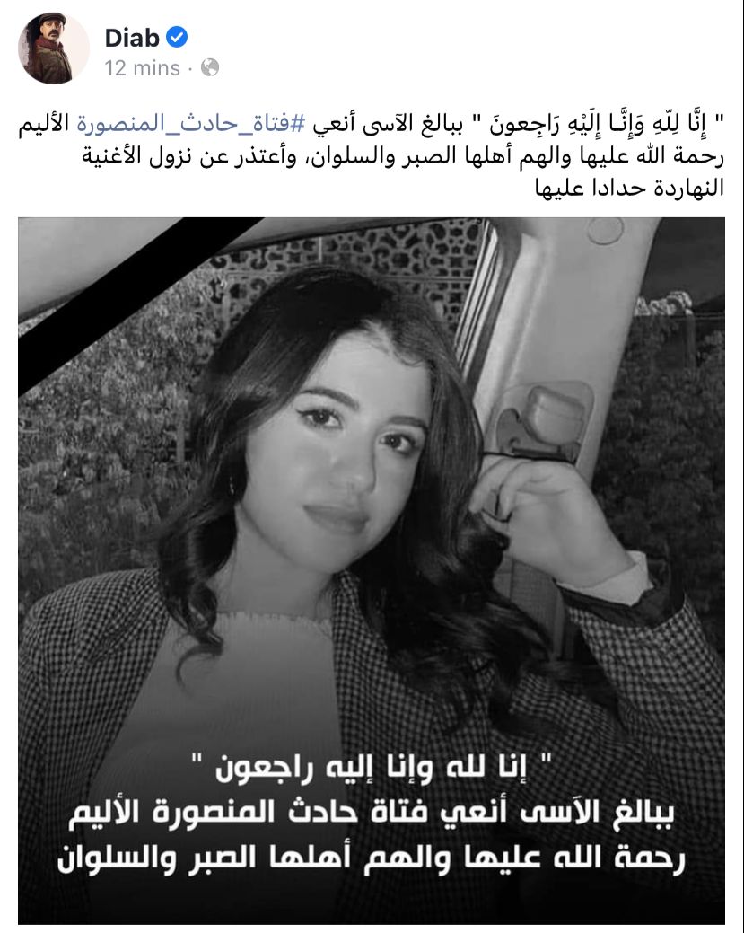 واعتذر دياب عن طرح أغنيته الجديدة ياتي ياتي اليوم عبر صفحته الشخصية فيس بوك قائلا: إِنَّا لِلّهِ وَإِنَّـا إِلَيْهِ رَاجِعونَ ببالغ الأسى أنعى فتاة حادث المنصورة الأليم رحمة الله عليها وألهم أهلها الصبر والسلوان، وأعتذر عن نزول الأغنية النهاردة حدادا عليها.