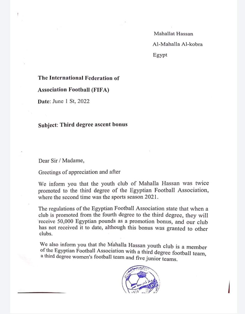 وتقدم سمير أبوسعيد رئيس مجلس إدارة مركز شباب محلة حسن، المتواجد حاليًا بدوري القسم الثالث، بشكوى إلى الاتحاد الدولي لكرة القدم ضد مسؤولي الاتحاد المصري، لعدم صرف مبلغ 50 ألف جنية قيمة المكافأة المقدرة للفرق الصاعدة من الدرجة الرابعة إلى الثالثة.