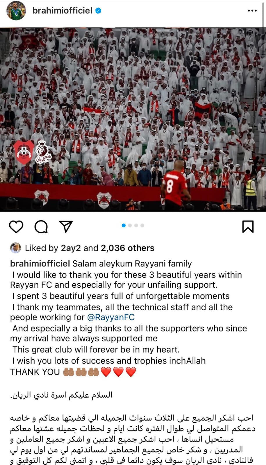 وتابع نجم منتخب الجزائر: كانت أيام ولحظات جميلة من الصعب أن أنساها.. أحب أشكر جميع اللاعبين والمدربين والعاملين، وكذلك الجماهير على مُساندتهم لي منذ أول يوم لي هنا مع الفريق.. نادي الريان سوف يكون دائمًا في قلبي.. أتمنى لكم كل التوفيق والألقاب.