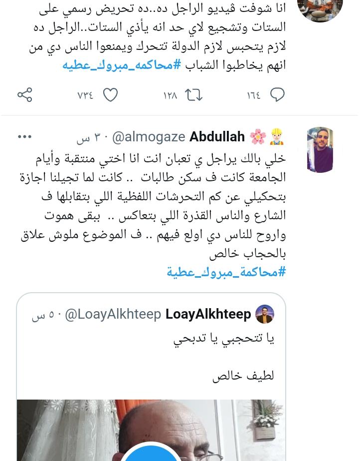 وعلق أحدهم عبر تويتر: أنا شوفت ڤيديو الراجل ده.. ده تحريض رسمي على الستات وتشجيع لأي حد إنه يأذي الستات..الراجل ده لازم يتحبس لازم الدولة تتحرك ويمنعوا الناس دي من إنهم يخاطبوا الشباب.