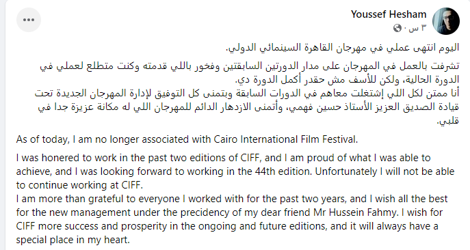وكتب يوسف هشام عبر حسابه الشخصي على موقع التواصل الاجتماعي فيسبوك، الآتي: اليوم انتهى عملي في مهرجان القاهرة السينمائي الدولي، تشرفت بالعمل في المهرجان على مدار الدورتين السابقتين وفخور باللي قدمته وكنت متطلع لعملي في الدورة الحالية، ولكن للأسف مش هقدر أكمل الدورة دي، أنا ممتن لكل اللي اشتغلت معاهم في الدورات السابقة وبتمنى كل التوفيق لإدارة المهرجان الجديدة تحت قيادة الصديق العزيز حسين فهمي، وأتمنى الازدهار الدائم للمهرجان اللي له مكانة عزيزة جدًا في قلبي.