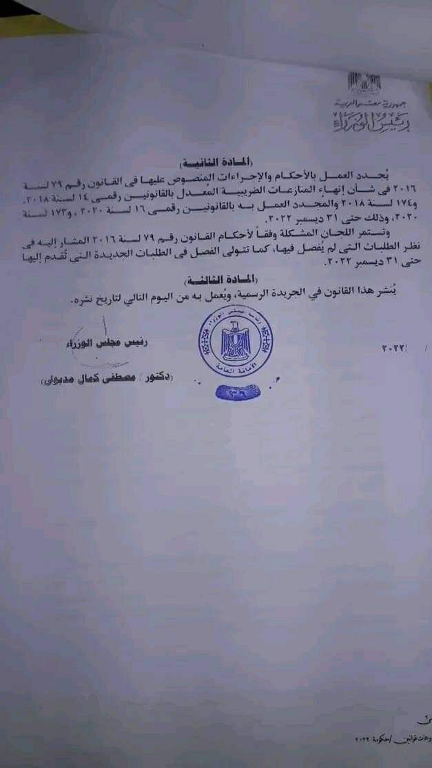 بينما لفتت التعديلات إلى أنه بالنسبة إلى ديـن الضريبة أو الرسم المستحـق، واجـب الأداء قبـل تـاريخ العمـل بهـذا القانون، أو حتى 15- 7- 2022، أيهما يلي الآخر، أيًّا كـان سـبب وجـوب الأداء، بشرط أن يسدد الممـول أو المكلف أصـل ديـن الضريبة أو الرسـم كـاملًا حتى تـاريخ العمـل بهـذا القانون، أو حتى 15 يوليـو 2022، على أن يسدد نسبة 50% الباقية التي لم يتم التجاوز عنها خلال ستة أشهر من تاريخ العمل بهذا القانون.