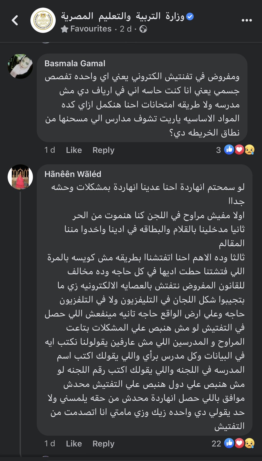 وكتبت بسملة جمال، طالبة بالثانوية العامة، أنه يجب الاعتماد على العصا الإلكترونية في التفتيش، بدلا من التفتيش الذاتي، متابعة: احنا هنكمل الامتحانات ازاي بالطريقة دي؟