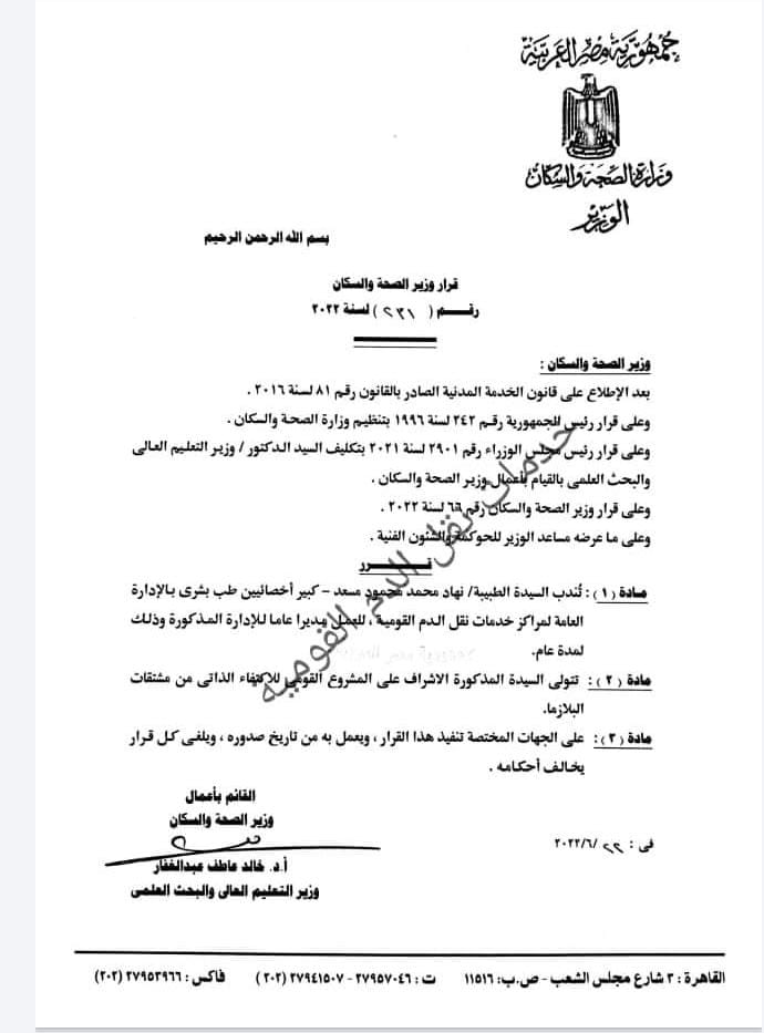ونص القرار، حصل القاهرة 24 على نسخة منه، ندب الطبيبة نهاد محمد محمود، كبير اخصائيين طب بشري بالإدارة العامة لمراكز خدمات نقل الدم القومية، للعمل مديرا عاما للإدارة المذكورة وذلك لمدة عام، وتتولى الطبيبة الإشراف على المشروع القومي للاكتفاء الذاتي من مشتقات البلازما.