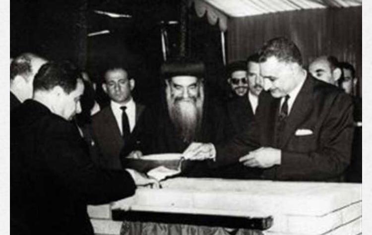 جمال عبد الناصر وكيرلس السادس في احتفال وضع حجر أساس الكاتدرائية وعودة الرفات المقدس