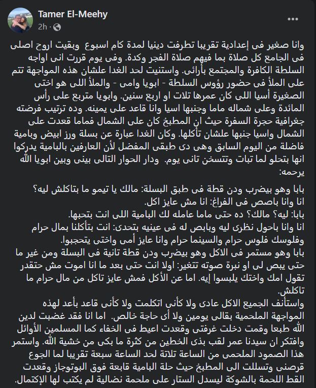 وأضاف تامر الميهي: استأنف الجميع الأكل عادي ولا كأني اتكلمت، ولا كأني قاعد بأعد لهذه المواجهة الملحمية بقالي يومين ولا أي حاجة خالص. أما أنا فقد غضبت لدين الله طبعا، وقمت دخلت غرفتي وقعدت أعيط في الخفاء كما المسلمين الأوائل، وأفتكر إن سيدنا عمر لقب بذي الخطين من كثرة ما بكى من خشية الله. واستمر هذا الصمود الملحمي من الساعة تلاتة لحد الساعة سبعة تقريبا لما الجوع قرصني وتسللت إلى المطبخ حيث حلة البامية قابعة فوق البوتوجاز وقعدت ألقط اللحمة بالشوكة ليسدل الستار على ملحمة نضالية لم يكتب لها الاكتمال.