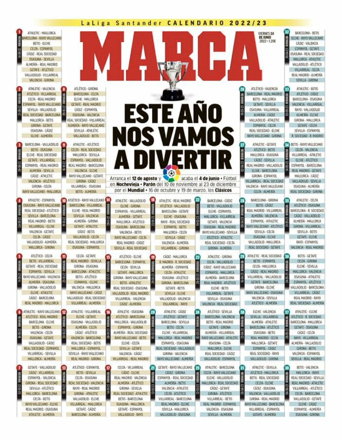 رصدت ماركا جدول مباريات الموسم المقبل من الدوري الإسباني، وعنونت في غلافها اليوم بالعنوان متعة ليس لها نهاية، حيث قالت أن الليجا تبدأ 12 أغسطس وتنتهي 4 يونيو، وسوف تكون هناك جولة ليلة رأس السنة، مع توقف في منتصف نوفمبر لكأس العالم.