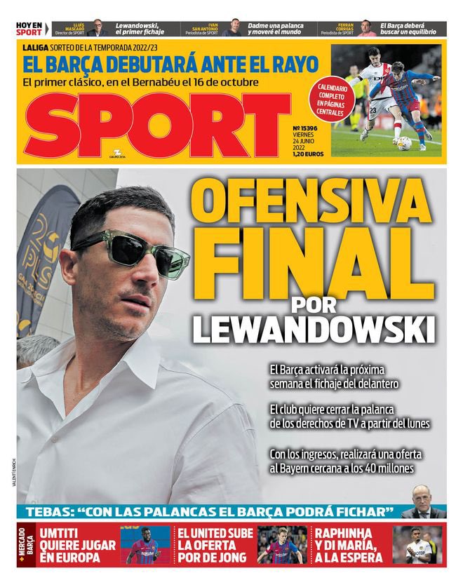 عنونت سبورت في غلافها اليوم بـ الحسم النهائي لصفقة ليفاندوفسكي، حيث سيتم التعاقد مع المهاجم الأسبوع المقبل، النادي يريد إغلاق رافعة حقوق البث التلفزيوني من يوم الأثنين.