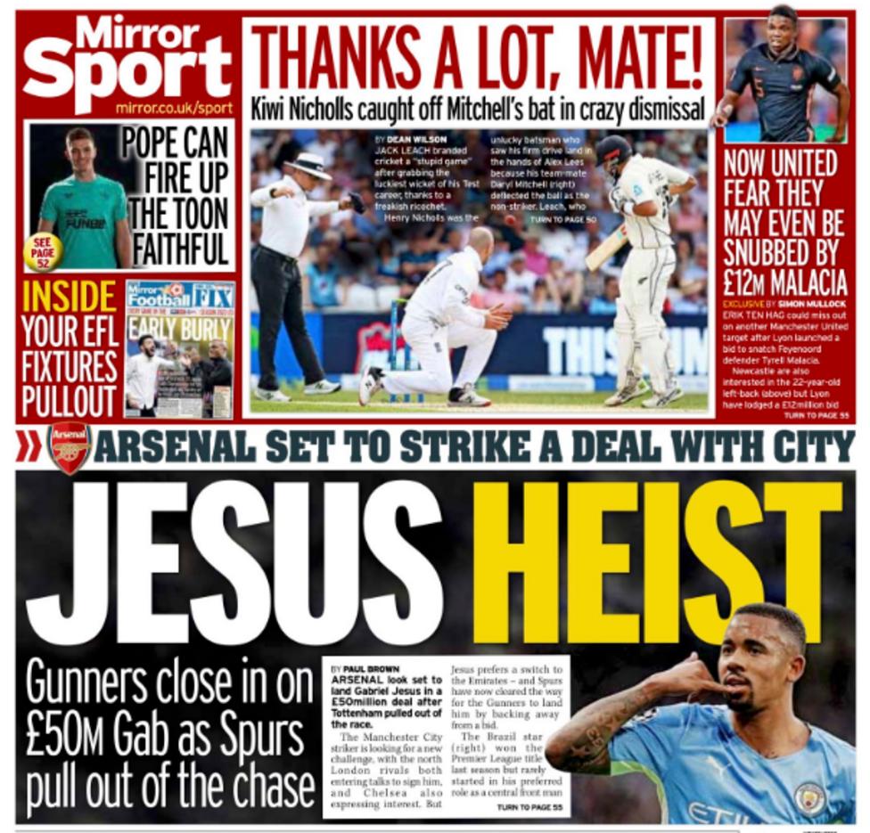 قالت ميرور في غلافها اليوم إن أرسنال على أعتاب حسم اتفاقه لضم خيسوس من ماتشستر سيتي، وذلك بمبلغ 50 مليون جنيه إسترليني.