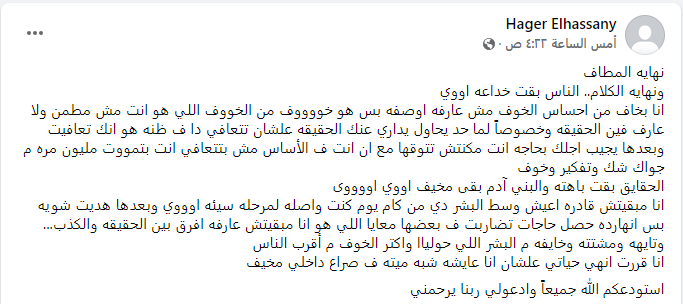 وأكملت منشورها: الحقائق بقت باهتة، والبني آدم بقى مخيف أوي أوي، وأنا ماقتش قادرة أعيش وسط البشر دي، من كام يوم كنت واصلة لمرحلة سيئة أوي، وبعدها هديت شوية، بس النهاردة حصلت حاجات، تضاربت في بعضها معايا، اللي هو أنا مابقتش عارفة أفرَّق بين الحقيقة والكذب، وتايهة ومشتتة، وخايفة من البشر اللي حواليا، وأكتر الخوف، من أقرب الناس، أنا قررت أنهي حياتي؛ علشان أنا عايشة شِبه ميتة، في صراع داخلي مخيف، أستودعكم الله جميعًا، وادعولي ربنا يرحمني.