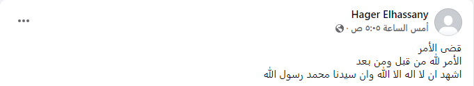 وكتبت هاجر، منشورًا آخر، كتبت فيه: قُضِيَ الأمر، الأمر لله من قبل ومن بعد، أشهد أن لا إله إلا الله وأن سيدنا محمد رسول الله.