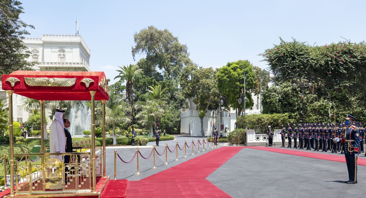 أقيمت مراسم استقبال رسمية للشيخ تميم بن حمد آل ثاني، أمير دولة قطر، خلال استقبال الرئيس عبد الفتاح السيسي له، اليوم السبت، بقصر الاتحادية، لأول زيارة له إلى القاهرة.