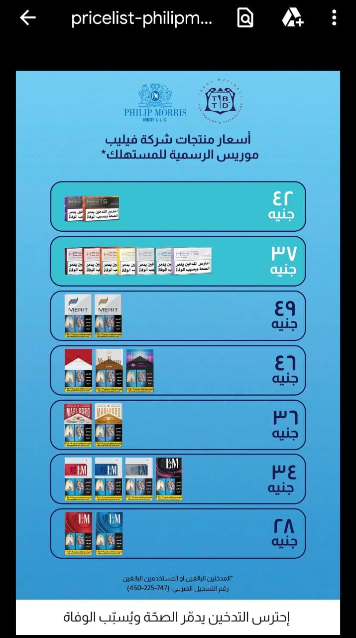 وبحسب جدول الأسعار الذي أرسلته شركة فيليب موريس إلى مصلحة الضرائب، فقد بلغ سعر سجائر إل إم الأحمر والأزرق والفضي 34 جنيهًا، مقابل 33 جنيهًا.