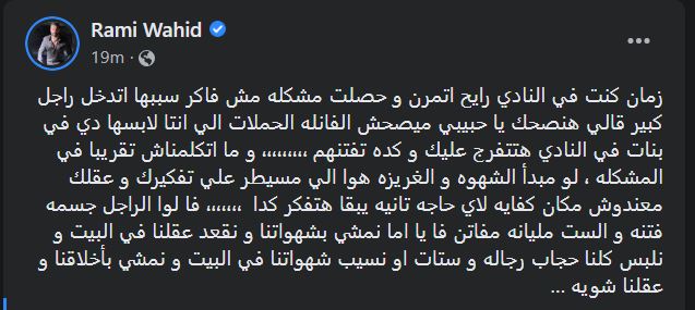 وكتب رامي وحيد عبر حسابه بموقع فيس بوك: زمان كنت في النادي رايح اتمرن وحصلت مشكله مش فاكر سببها اتدخل راجل كبير قالي هنصحك يا حبيبي ميصحش الفانلة الحملات الي انتا لابسها دي في بنات في النادي هتتفرج عليك وكده تفتنهم، وما اتكلمناش تقريبا في المشكلة. لو مبدأ الشهوة والغريزة هوا اللي مسيطر علي تفكيرك وعقلك معندوش مكان كفاية لأي حاجة تانية يبق هتفكر كدا.