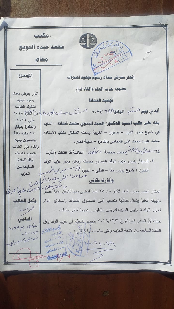 تقدم الدكتور السيد البدوي، رئيس حزب الوفد الأسبق، بإنذار رسمي على يد محضر إلى رئيس حزب الوفد الحالي، الدكتور عبدالسند يمامة؛ لعرض سداد رسوم تجديد اشتراك عضوية حزب الوفد وإلغاء قرار تجميد النشاط.