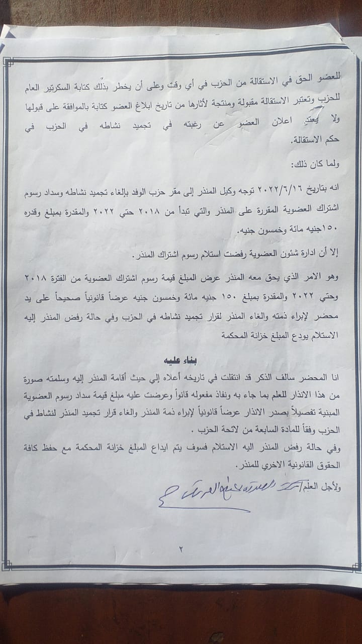 وتابع بأن المنذر جمد نشاطه في الحزب بتاريخ 2/12/2018 وفق المادة السابعة من لائحة الحزب، وأنه بتاريخ 16/6/2022 توجه وكيل المنذر إلى مقر حزب الوفد بإلغاء تجميد نشاطه وسداد رسوم اشتراك العضوية المقررة على المنذر، والتي تبدأ من 2018 حتى 2022 والمقدرة بمبلغ وقدره 150 جنيها؛ إلا أن إدارة شؤون العضوية رفضت استلام رسوم اشتراك المنذر.