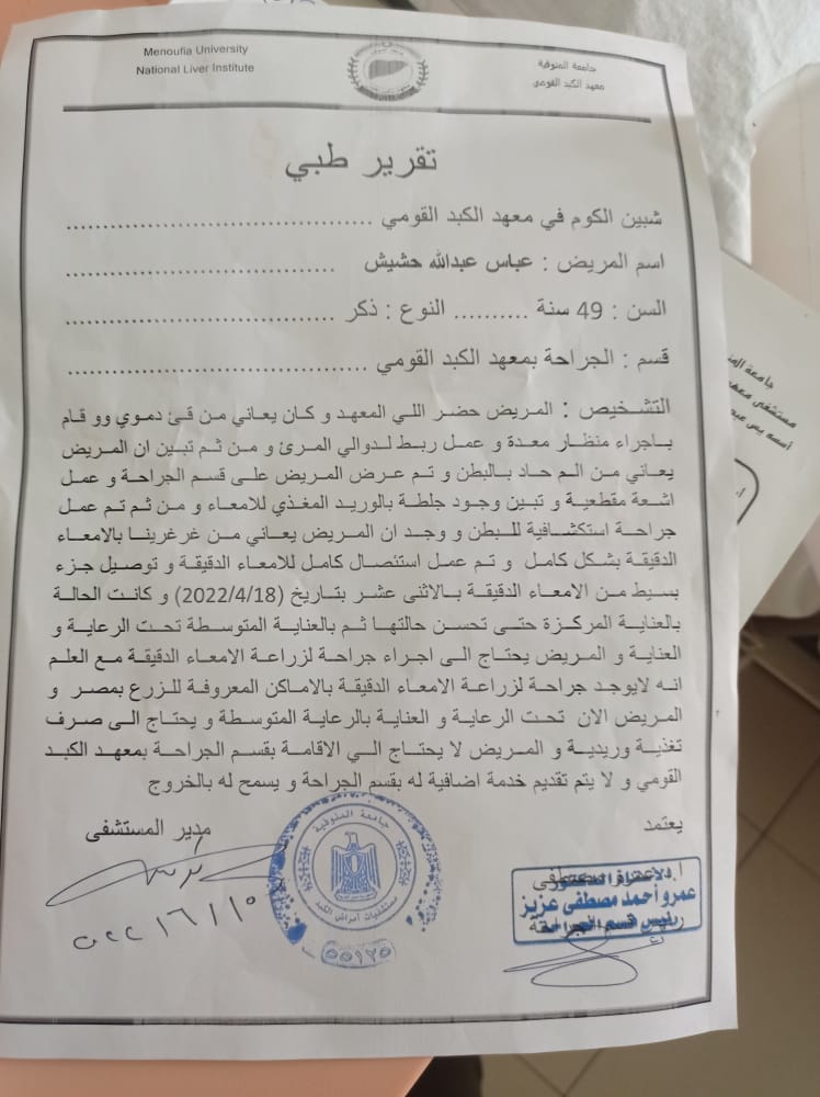 نستغيث بوزير الصحة بالتدخل، أبي يعاني نزيف مجهول، وبحاجة لزراعة أمعاء بعد استئصالها كاملة بالمعهد القومي للكبد بالمنوفية.. هكذا بدأ عبده عباس، يروي تفاصل الحالة الصحية لوالده الذي خضع لعدد من العمليات الجراحية والمناظير؛ لعلاج آلام شديدة في البطن وقيء دم، انتهت باستئصال الأمعاء كاملة ونزيف مجهول.