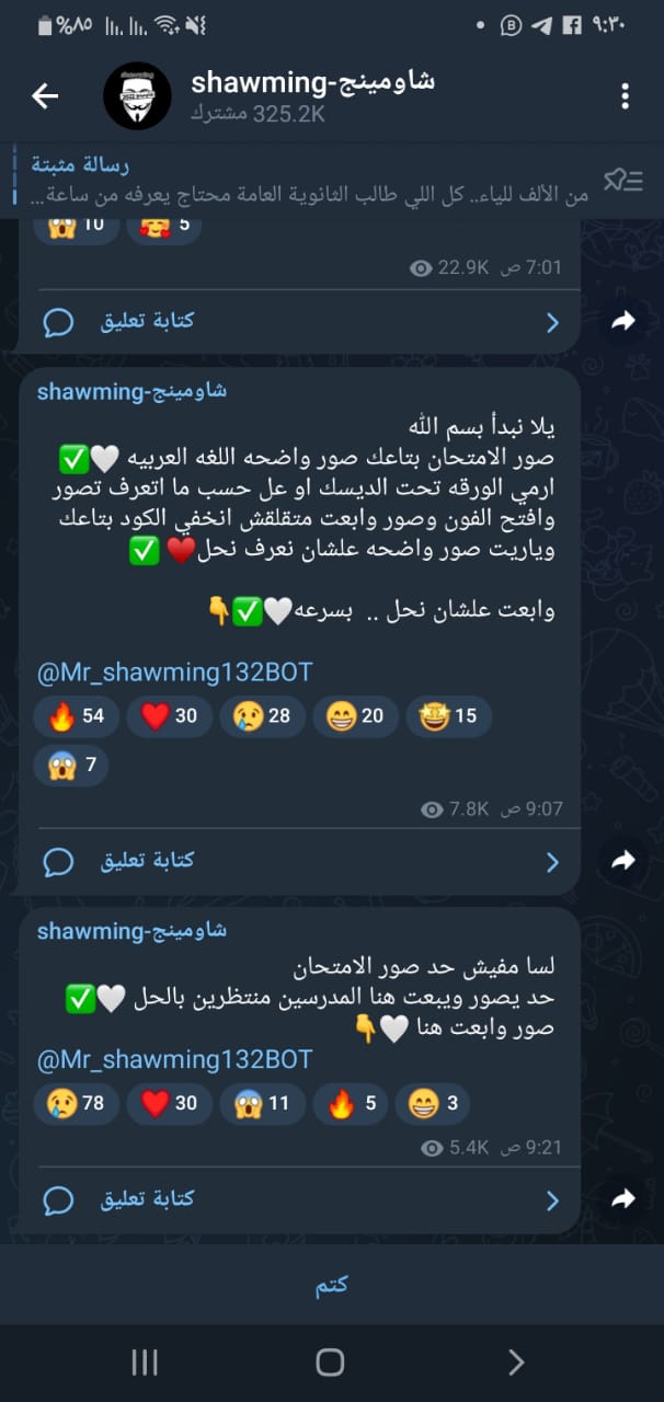 ناشد مسئولي جروب شاومينج لتسريب الامتحانات، عبر تطبيق تليجرام، الطلاب، بسرعة تصوير ورقة امتحان اللغة العربية، مؤكدين أن الامتحان ليس معهم، وسط مناشدات من الطلاب بسرعة إرسال الحل لهم.