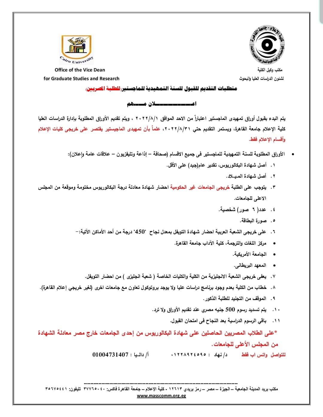وأشارت كلية الإعلام في مستند عن متطلبات القبول بالسنة التمهيدية للماجيستير، إلى أن التقديم يقتصر فقط على طلاب كليات الإعلام، وأقسام الإعلام فقط، مؤكدة أن التقديم حاليا يقتصر على الطلاب المصريين فقط.