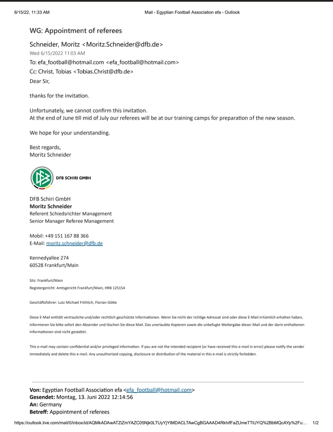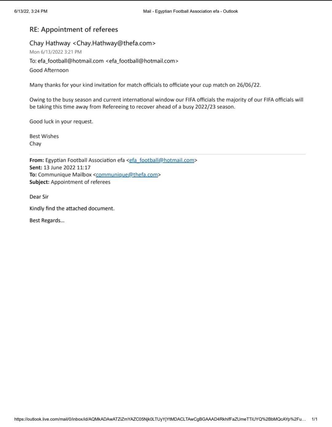 وقال الاتحاد المصري لكرة القدم إنه كان هناك اعتذارات من جانب حكام الدوريات الخمس الكبرى، الإنجليزي والإيطالي والإسباني والألماني والفرنسي عن إدارة مباراة الأهلي وبيراميدز في ربع نهائي كأس مصر اليوم.