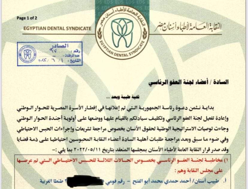 وكانت النقابة العامة لأطباء الأسنان، وجهت خطابا للجنة العفو الرئاسية، بالإفراج عن 3 سجناء، محبوسين احتياطيًا على ذمة قضايا، وشملت الأسماء التي أرسلتها نقابة أطباء الأسنان، كل من أحمد حمدي محمد أبو الفتح، ومحمد أحمد حسيني محمد، ومحمد إسماعيل حسن.