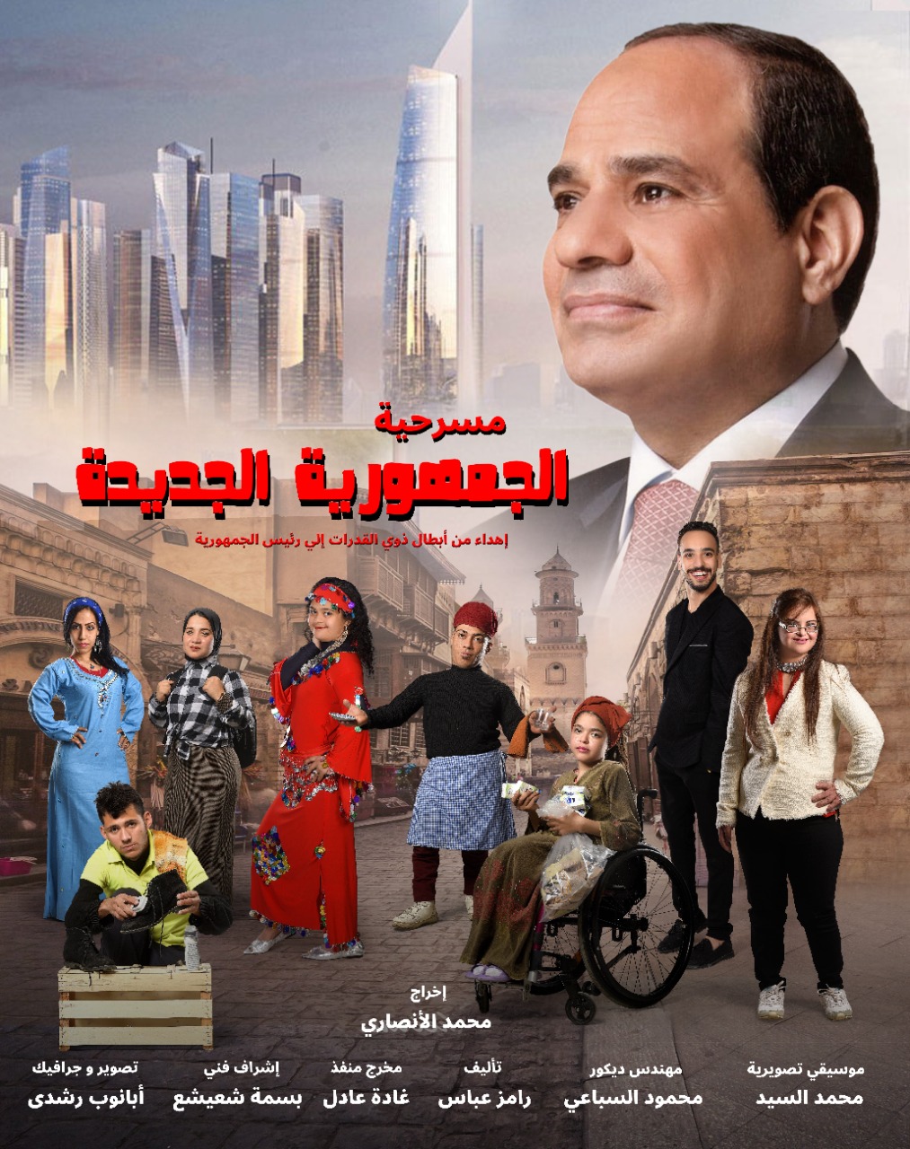 يستعد 16 ممثلا من ذوي الهمم لتقديم عمل مسرحي بعنوان الجمهورية الجديدة، وذلك لتوثيق إنجازات الجمهورية الجديدة، ولتقدير دعم الرئيس عبد الفتاح السيسي لـ ذوي الاحتياجات الخاصة.