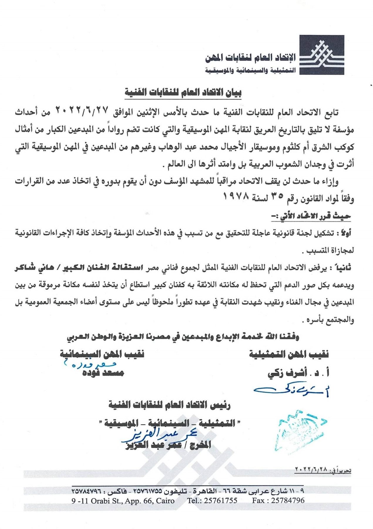 وأضاف: إزاء ما حدث لن يقف الاتحاد مراقبًا للمشهد المؤسف دون أن يقوم بدوره فى اتخاذ عدد من القرارات وفقا لمواد القانون رقم 35 لسنة 1978، حيث قرر الاتحاد الآتى: أولًا: تشكيل لجنة قانونية عاجلة للتحقيق مع من تسبب فى هذه الأحداث المؤسفة واتخاذ كافة الإجراءات القانونية لمجازاة المتسبب، ثانيًا: يرفض الاتحاد العام للنقابات الفنية الممثل لجموع فنانى مصر استقالة الفنان الكبير هانى شاكر، ويدعمه بكل صور الدعم التي تحفظ له مكانته اللائقة به كفنان كبير استطاع أن يتخذ مكانة مرموقة بين المبدعين فى مجال الغناء، ونقيب شهدت النقابة فى عهده تطورًا ملحوظًا ليس على مستوى أعضاء الجمعية العمومية بل والمجتمع بأسره.