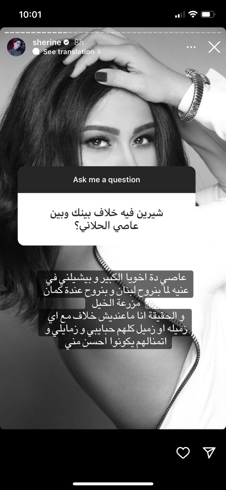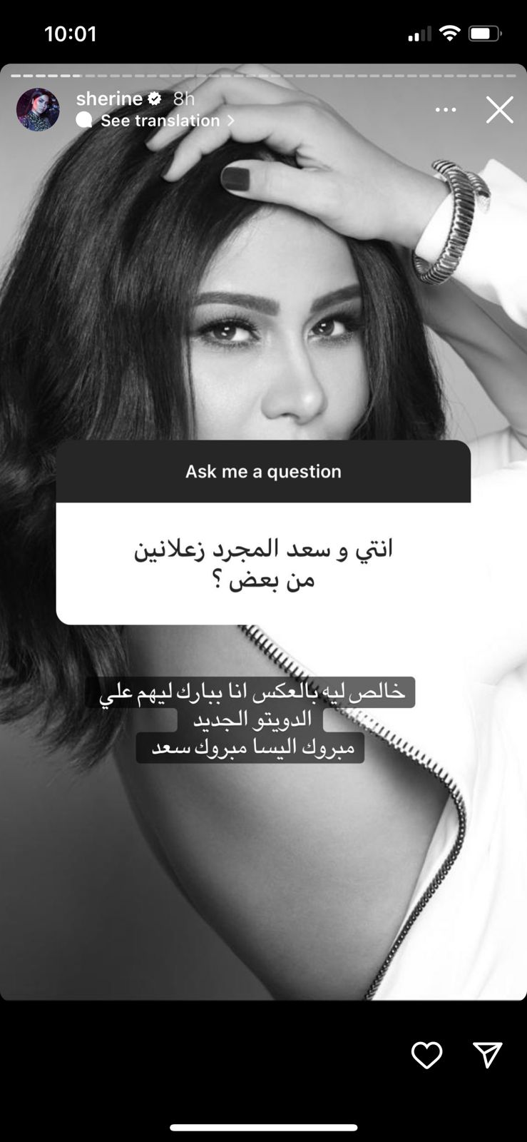 وقالت شيرين عبد الوهاب، عبر الاستوري الخاص بها على حسابها بـ انستجرام، ردّا على سؤال أحد المتابعين قائلًا: أنتي وسعد لمجرد زعلانيين من بعض، لترد عليه: خالص ليه بالعكس أنا ببارك ليهم، على الدويتو، الجديد مبروك إليسا مبروك سعد.