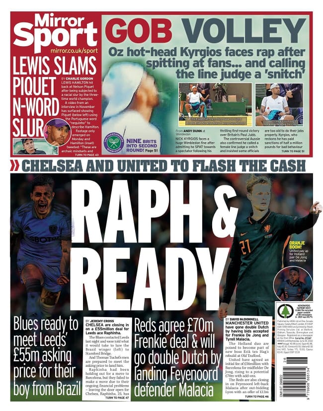 قالت ميرور في غلافها إن تشيلسي ومانشستر يونايتد يستعدان لدفع أموال صفقاتهم الجديدة، حيث سيضحي يونايتد بمبلغ 70 مليون إسترليني لضم الهولندي فرينكي دي يونج من برشلونة، فيما سيدفع البلوز مبلغ 55 مليون جنيه إسترليني لضم البرازيلي رافينيا دياز من فريق ليدز يونايتد.