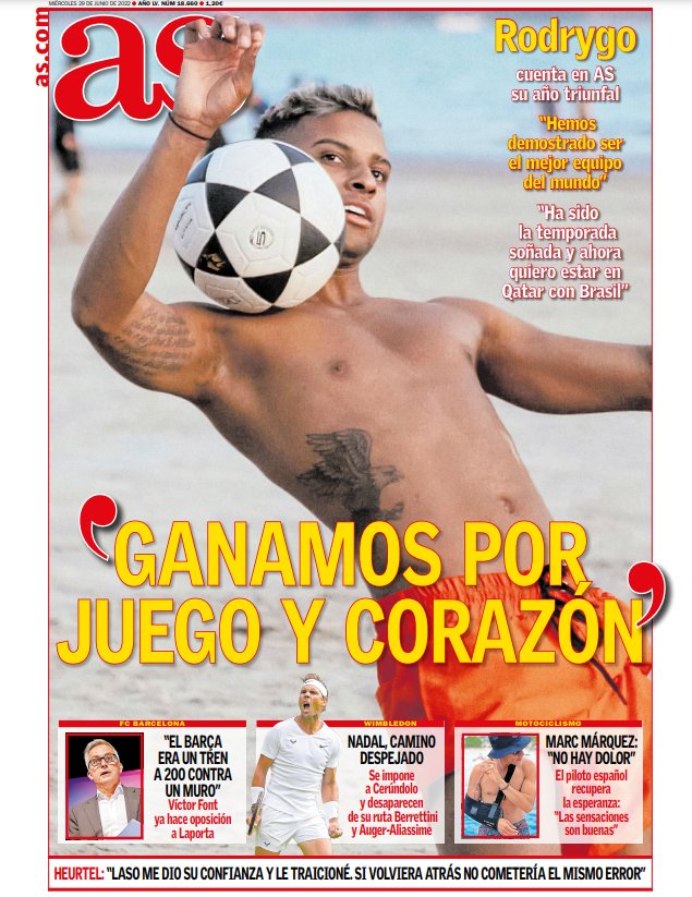 تصدر النجم البرازيلي رودريجو جوس لاعب فريق ريال مدريد الإسباني، غلاف آس لعدد اليوم، حيث نشرت الصحيفة مقابلة خاصة مع اللاعب، وقال بها إن الميرينجي أثبت حقًا أنه الأفضل في العالم بدوري أبطال أوروبا للموسم الأخير.