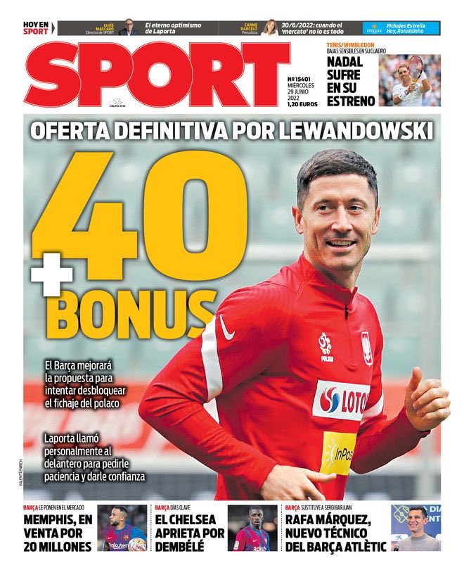 عنونت صحيفة سبورت في غلافها لعدد اليوم بـ العرض النهائي لضم ليفاندوفسكي، وقالت إن برشلونة حدد مبلغ 40 مليون يورو بالإضافة لمتغيرات للتعاقد مع المهاجم، وسيحسن برشلونة عرضه لمحاولة رفع العقبات عن انتقال البولندي.