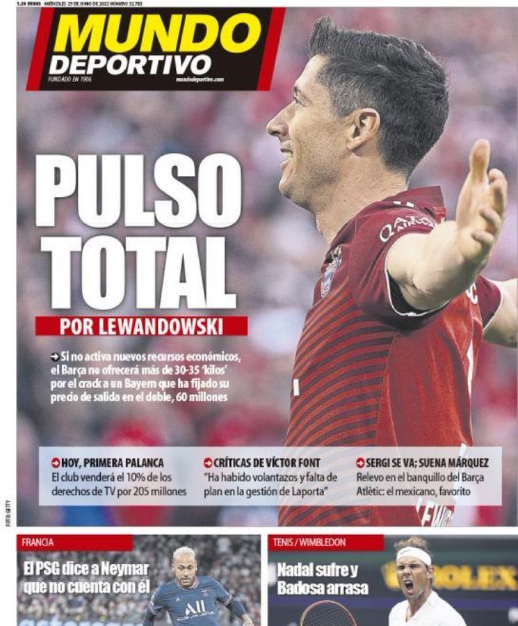 تصدر العنوان النبض الكلي لـ ليفاندوفسكي غلاف صحيفة موندو ديبورتيفو لعدد اليوم، وقالت إن مسؤولي برشلونة إذا لم ينشطوا الروافع الاقتصادية، فلن يقدموا عرضًا أكثر من 30 أو 35 مليون يورو لنجم بايرن ميونخ الذي حدد النادي سعر خروجه بضعف المبلغ، 60 مليون يورو.