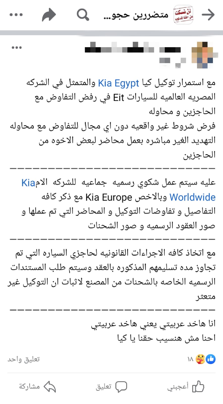 رفع متضررو وكيل كيا في مصر؛ شعار مش هنسيب حقنا يا كيا، حيث قال أحمد عبد الكريم، أحد المتضررين، أنه مع استمرار توكيل كيا Kia Egypt، ممثلًا في الشركة المصريه العالميه للسيارات Eit، في رفض التفاوض مع الحاجزين؛ سيتم الرجوع إلى الشركة الأم، وتوضيح كافة جوانب المشكلة لها.