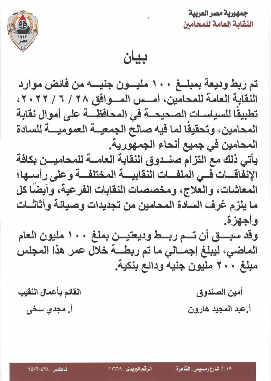 وقالت النقابة في بيان لها، إنه تم ربط وديعة بمبلغ 100 مليون جنيه من فائض موارد النقابة العامة للمحامين، تطبيقًا للسياسات الصحيحة في المحافظة على أموال نقابة المحامين، وتحقيقًا لما فيه صالح الجمعية العمومية للمحامين في جميع أنحاء الجمهورية.
