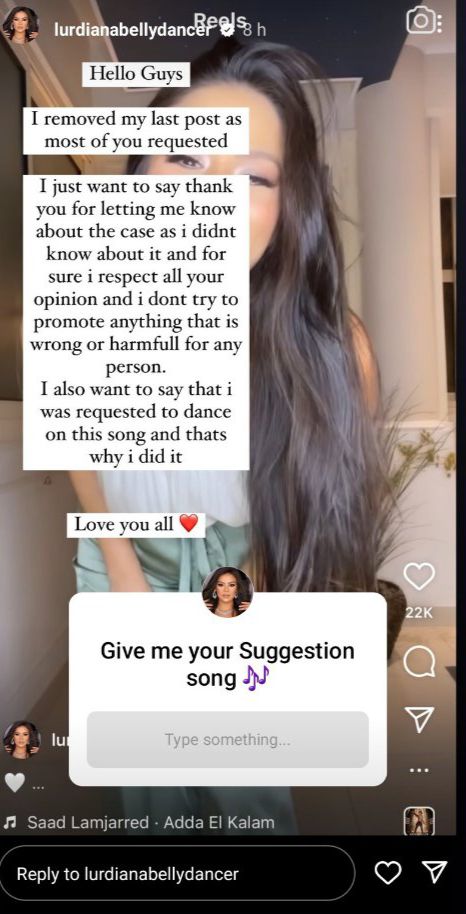 وجهت الراقصة البرازيلية لورديانا، رسالة اعتذار لجمهورها، بعد حذفها رقصة لها على أغنية عدى الكلام، الذي يقدمها الفنان المغربي سعد لمجرد؛ الأمر الذي عرّضها للعديد من الانتقادات، بسبب اتهامات الأخير في العديد من قضايا التحرش.