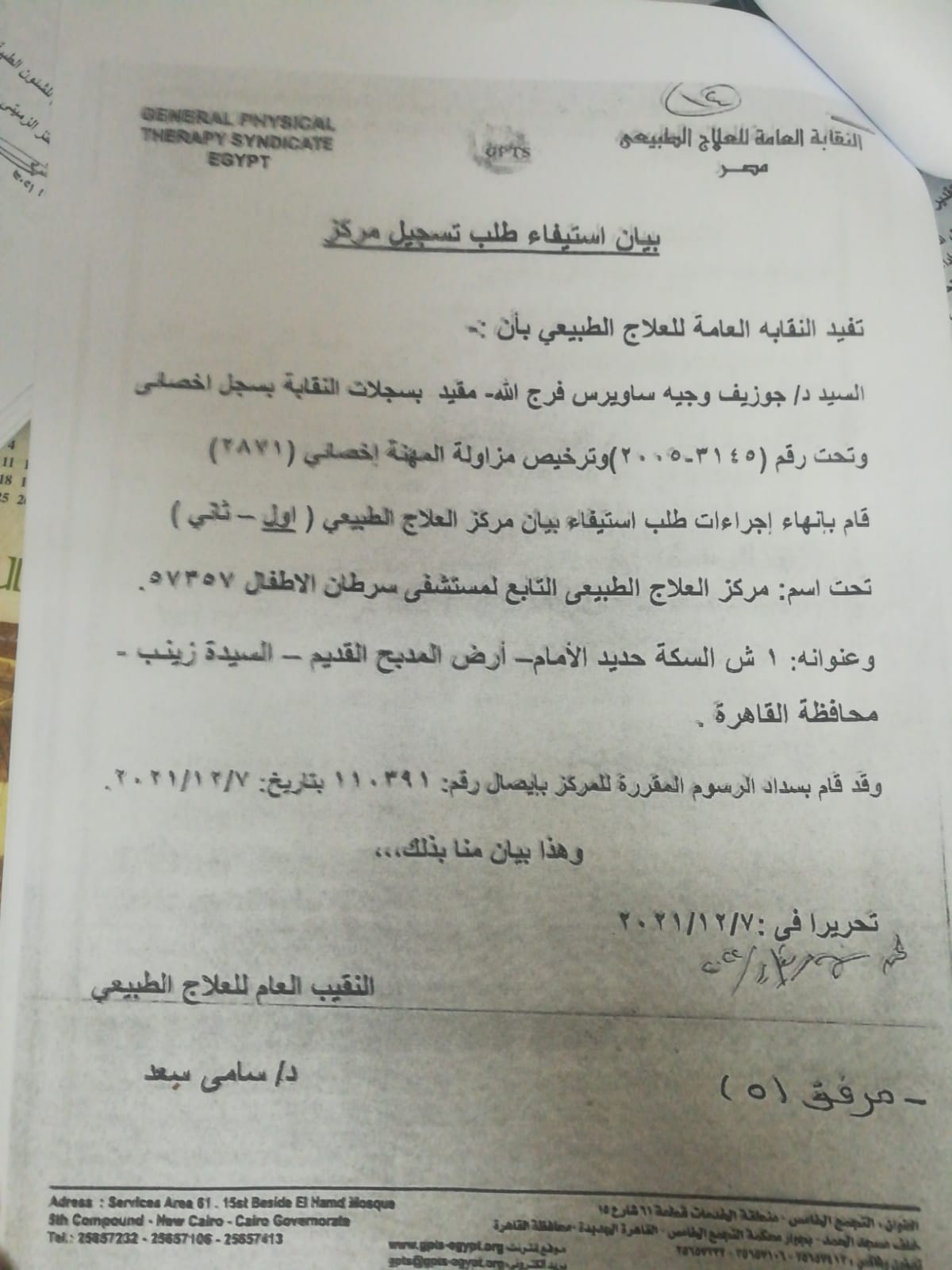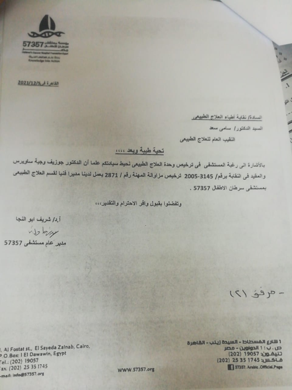 وفي السابق قال الدكتور سامي سعد، النقيب العام لنقابة العلاج الطبيعي لـ القاهرة 24، إن مؤسسة 57375 لعلاج سرطان الأطفال، تدير مركزا للعلاج الطبيعي بدون ترخيص، لافتا إلى أنه يعمل به خريجو كليات التربية الرياضية ومتخصصين في الطب الطبيعي والروماتيزم، وليس أخصائيو علاج طبيعي.