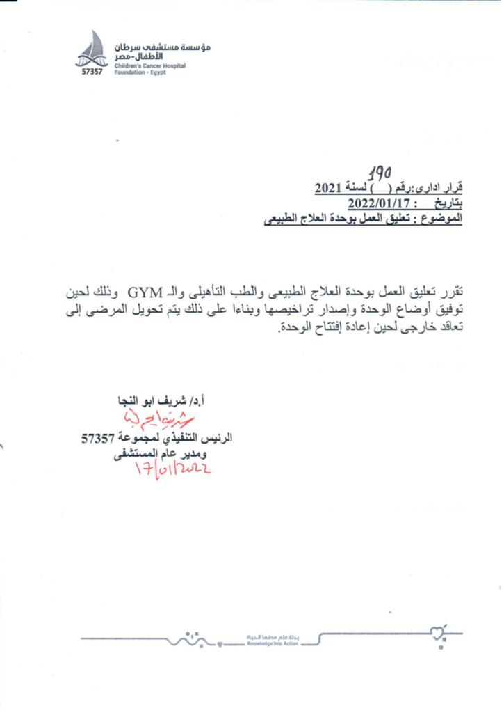 أوقف الدكتور شريف أبو النجا، الرئيس التنفيذي لمؤسسة 57357عددا من أطباء العلاج الطبيعي عن العمل بالمستشفى، ثم أغلق قسم العلاج الطبيعي لكونه غير مرخص من قبل النقابة العامة للعلاج الطبيعي، وإدارة العلاج الحر.