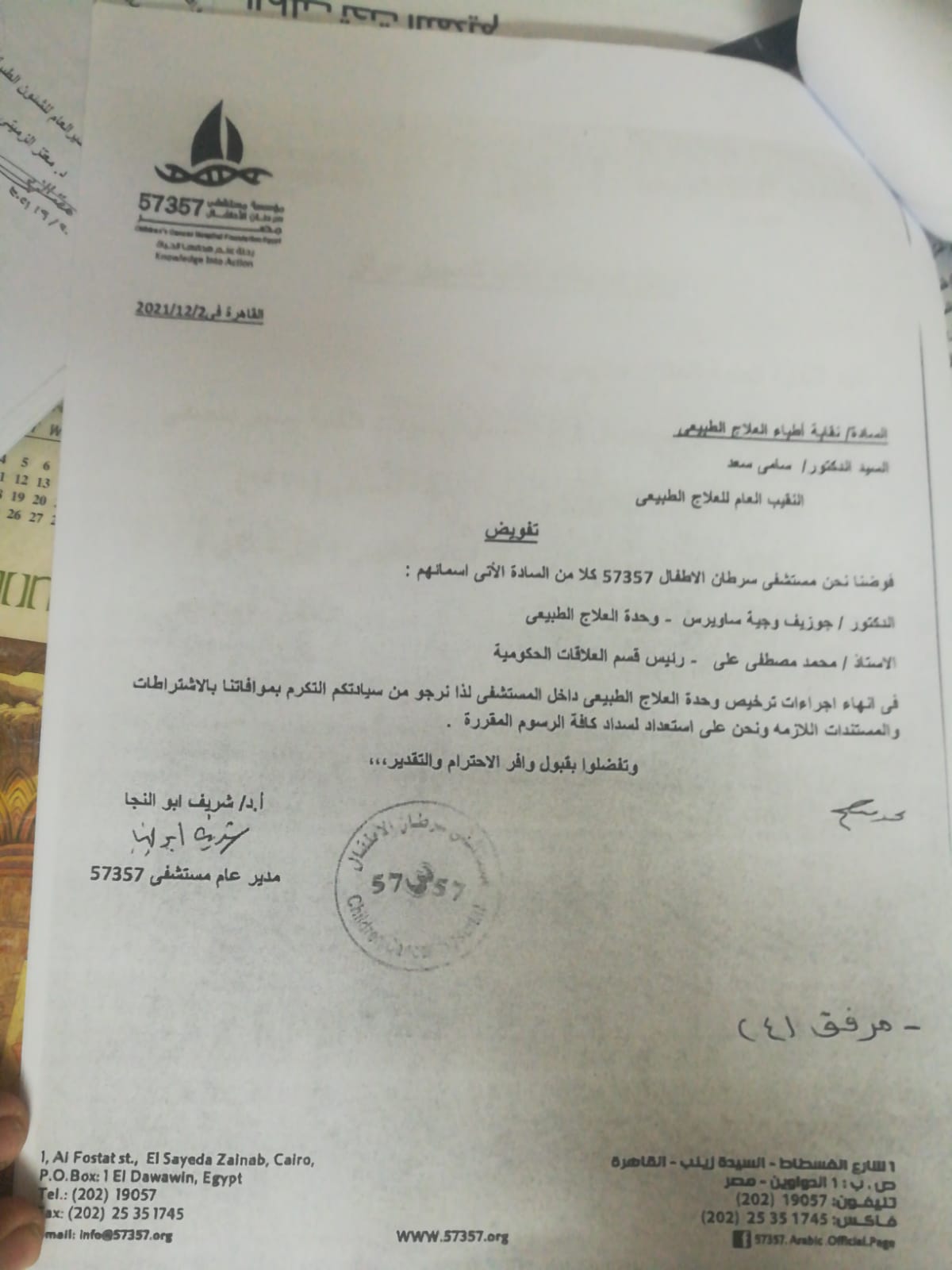 وأضاف سعد أن مدير مؤسسة 57375 لعلاج سرطان الأطفال، يدير مركزا للعلاج الطبيعي غير حاصل على ترخيص من النقابة العامة للعلاج الطبيعي، موضحًا أن تلك التخصصات السابق ذكرها التي تدير المركز ليس لها علاقة بالتعامل مع البرامج العلاجية لتأهيل الأطفال بعد جلسات العلاج.