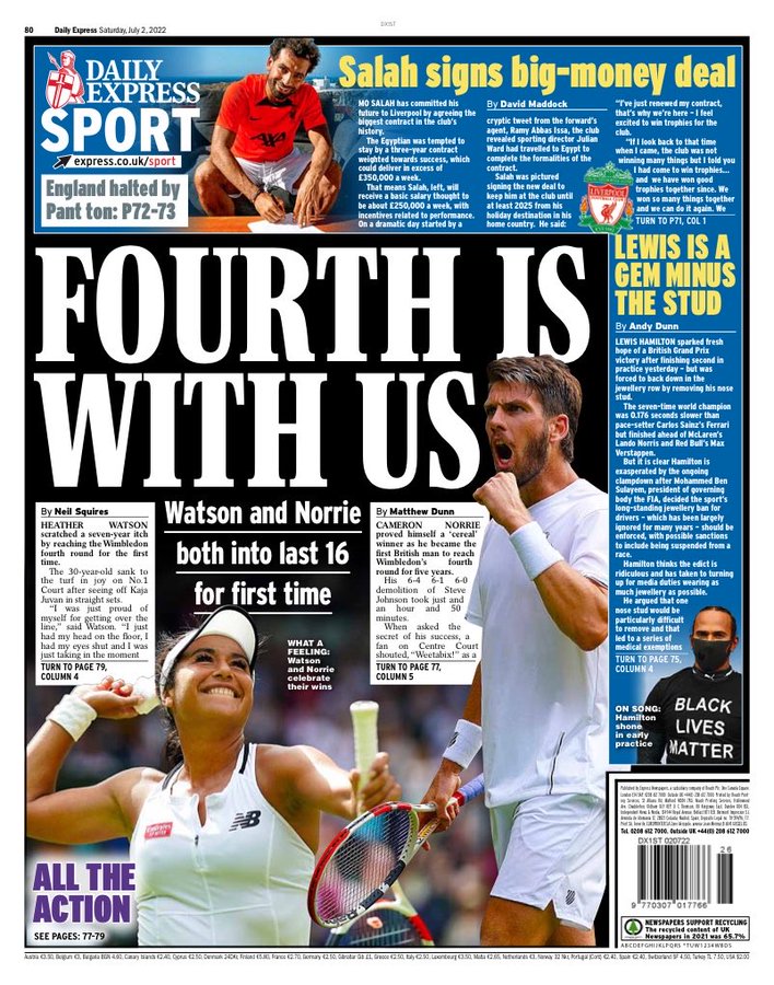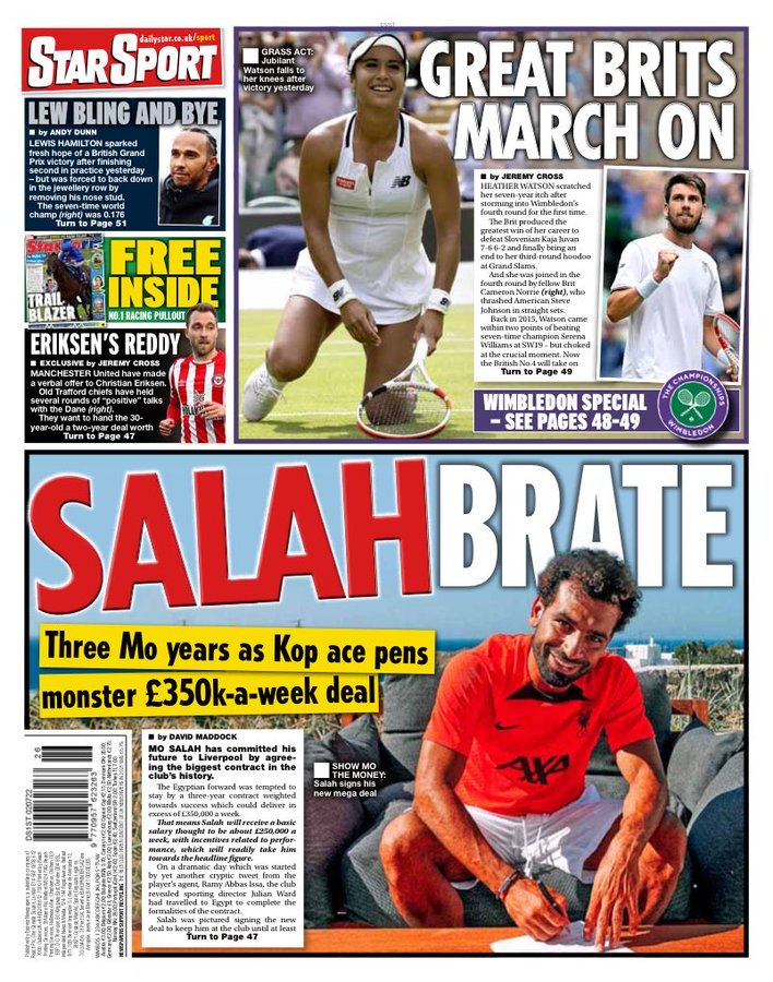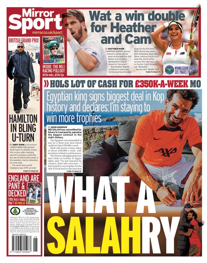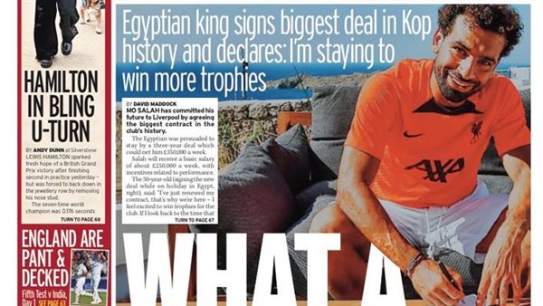 فيما وصفت صحيفة ميرور في غلافها لعدد اليوم، عقد محمد صلاح مع ليفربول بالتاريخي، حيث قالت يا له من راتب، وأشارت إلى أن الفرعون المصري وقع عقدًا استثنائيًا في تاريخ النادي الإنجليزي بهذا الرقم.