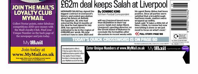 قالت ديلي ميل في غلافها لعدد اليوم، إن اتفاق الـ 62 مليون جنيه إسترليني على 3 مواسم، سيبقي محمد صلاح مع ليفربول بعدما وقع عقدًا يمتد حتى 2025 مع الريدز.
