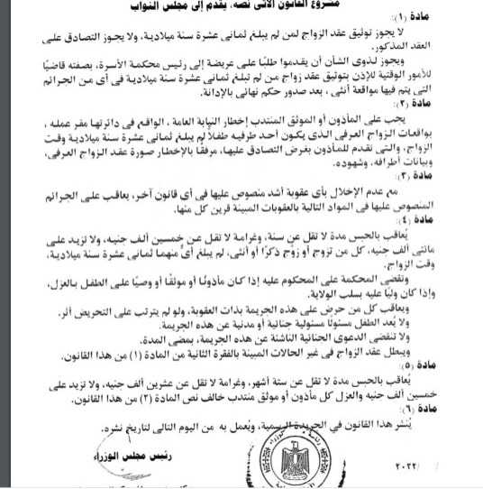 حصل القاهرة 24، على نسخة من القانون المقدم من الحكومة إلى البرلمان، برئاسة المستشار الدكتور حنفي جبالي، بشأن حظر زواج الأطفال، وذلك في ظل دخوله إلى لجنة الشؤون الدستورية والتشريعية بالمجلس، قبل فض دور الانعقاد الثاني يوم الثلاثاء المقبل.