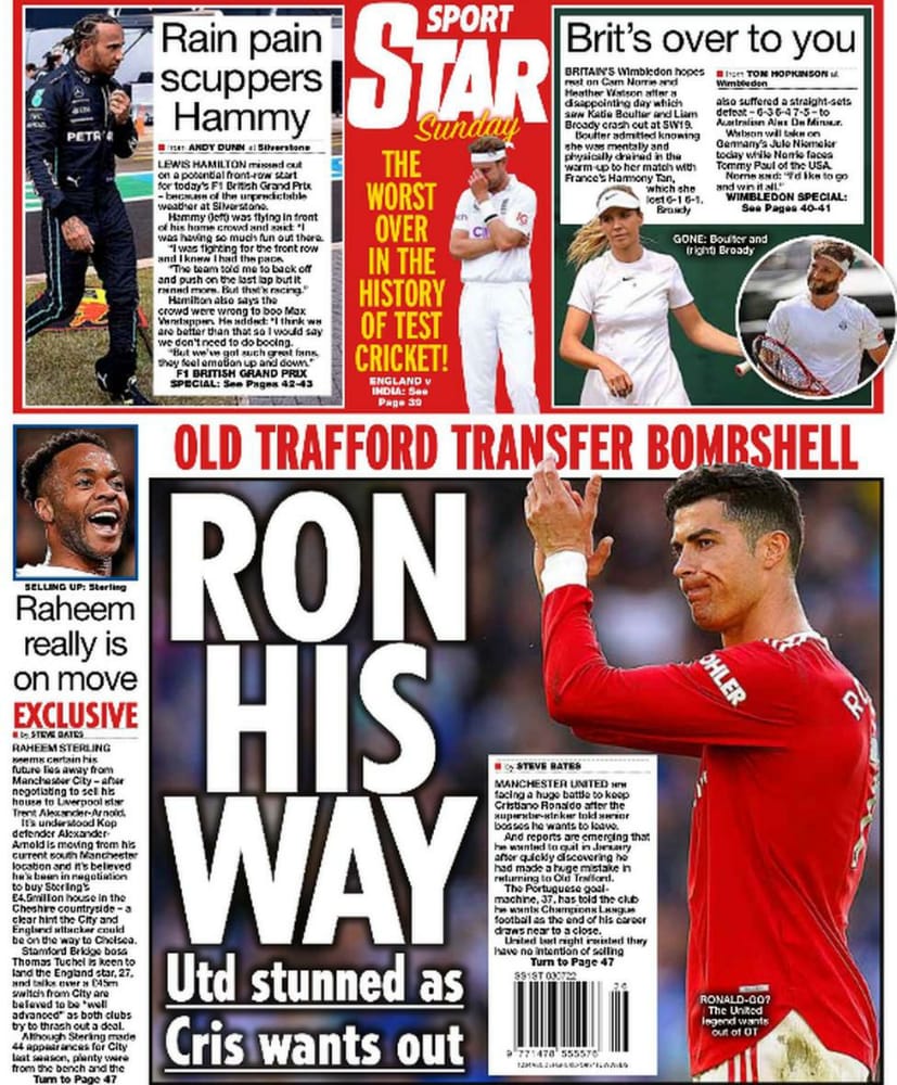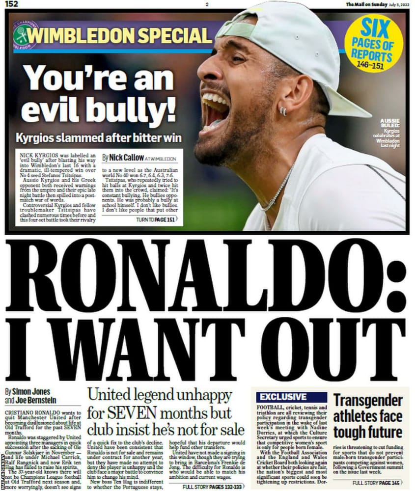 سلطت ديلي ميل الضوء في غلافها على اقتراب كريستيانو رونالدو من الرحيل عن مانشستر يونايتد، حيث عنونت بـ رونالدو: أنا أريد المغادرة.