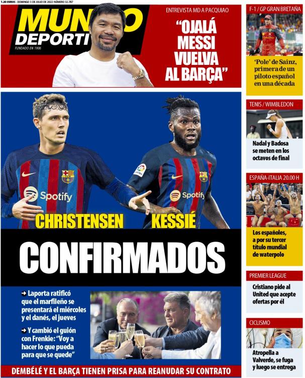 كشفت صحيفة موندو ديبورتيفو الإسبانية في غلافها اليوم، صفقتين قادمتين لنادي برشلونة، حيث قالت إن برشلونة ضم فرانك كيسي لاعب ميلان وأندرياس كريستينسن لاعب تشيلسي، بشكل مجاني، والإعلان الخميس المقبل.
